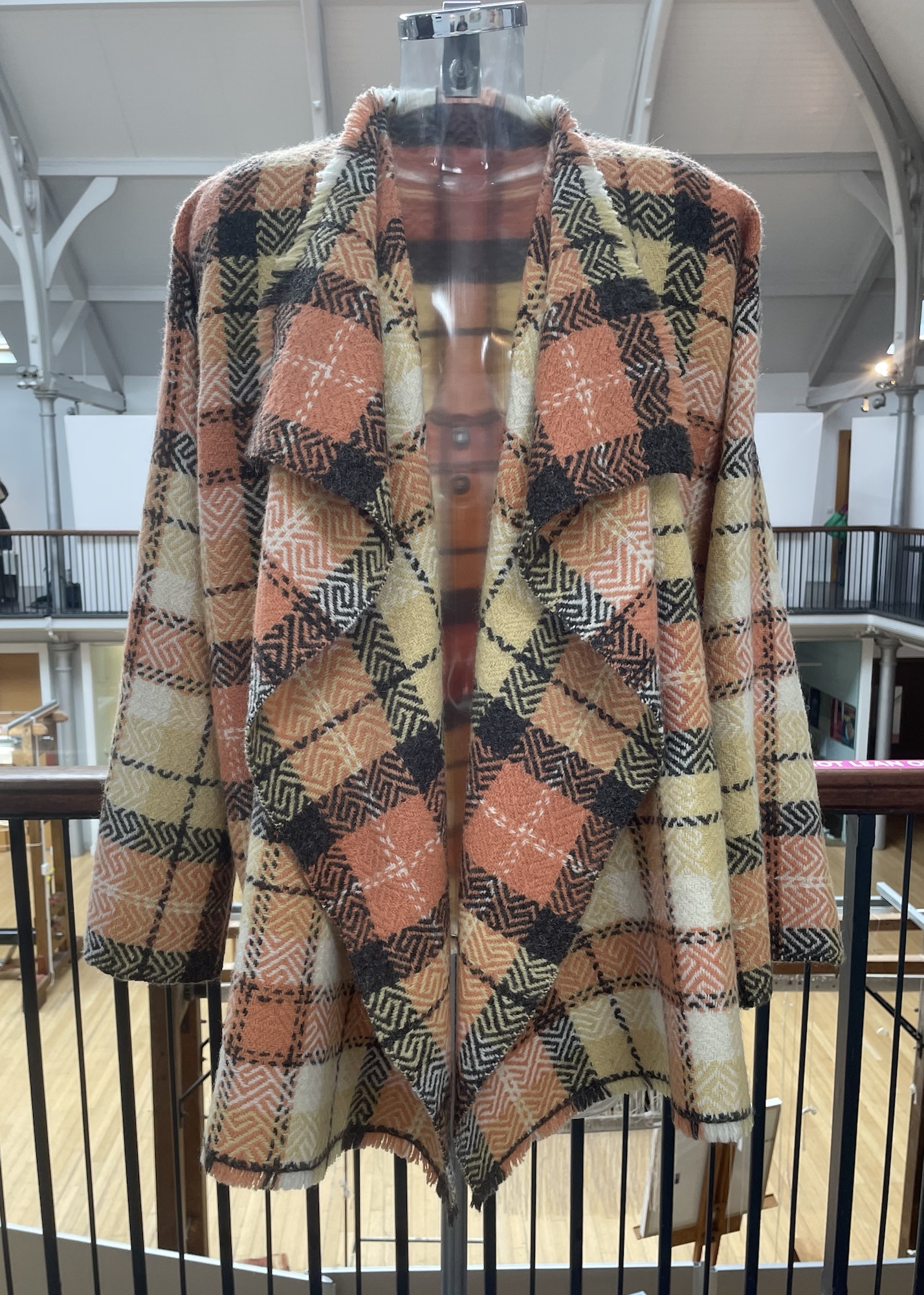 This pieces providence :- woven in specially commissioned Cheviot weaving yarn from a single flock reared in the borderlands celebrating the natural “brockie” grey/brown/black fleece as well as the natural white. Dyed with Madder and Marigolds from Janet’s dye garden. The over checking is proportionately based on an ancient Fife tartan and the weave structure itself is based on the Pictish stone carvings found on the east coast of Scotland- the key pattern with its meaning of no beginning or end eternal love. Truly of place piece.